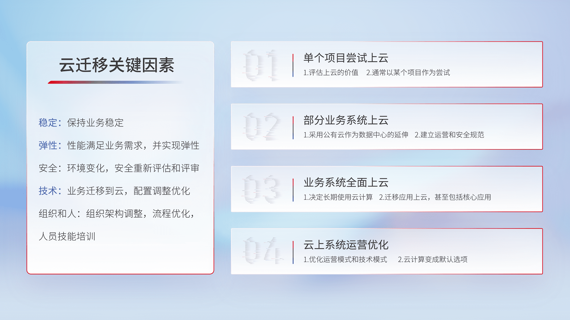 结合实际业务,,从规划设计、、云平台选型、、云原生改造、、、、数据迁移、、、、集成交付,,,迁移全过程为客户识别最佳上云路径,,,做好风险识别管理,,设计网络架构、、、、身份权限、、、安全审计合规、、、操作审计、、、、日志审计、、、监控告警策略、、、多站点容灾设计等,,,,对云上基础设施进行整体规划,,,,提升IT治理水平,,,,以满足弹性、、高可用、、高性能的需求。。