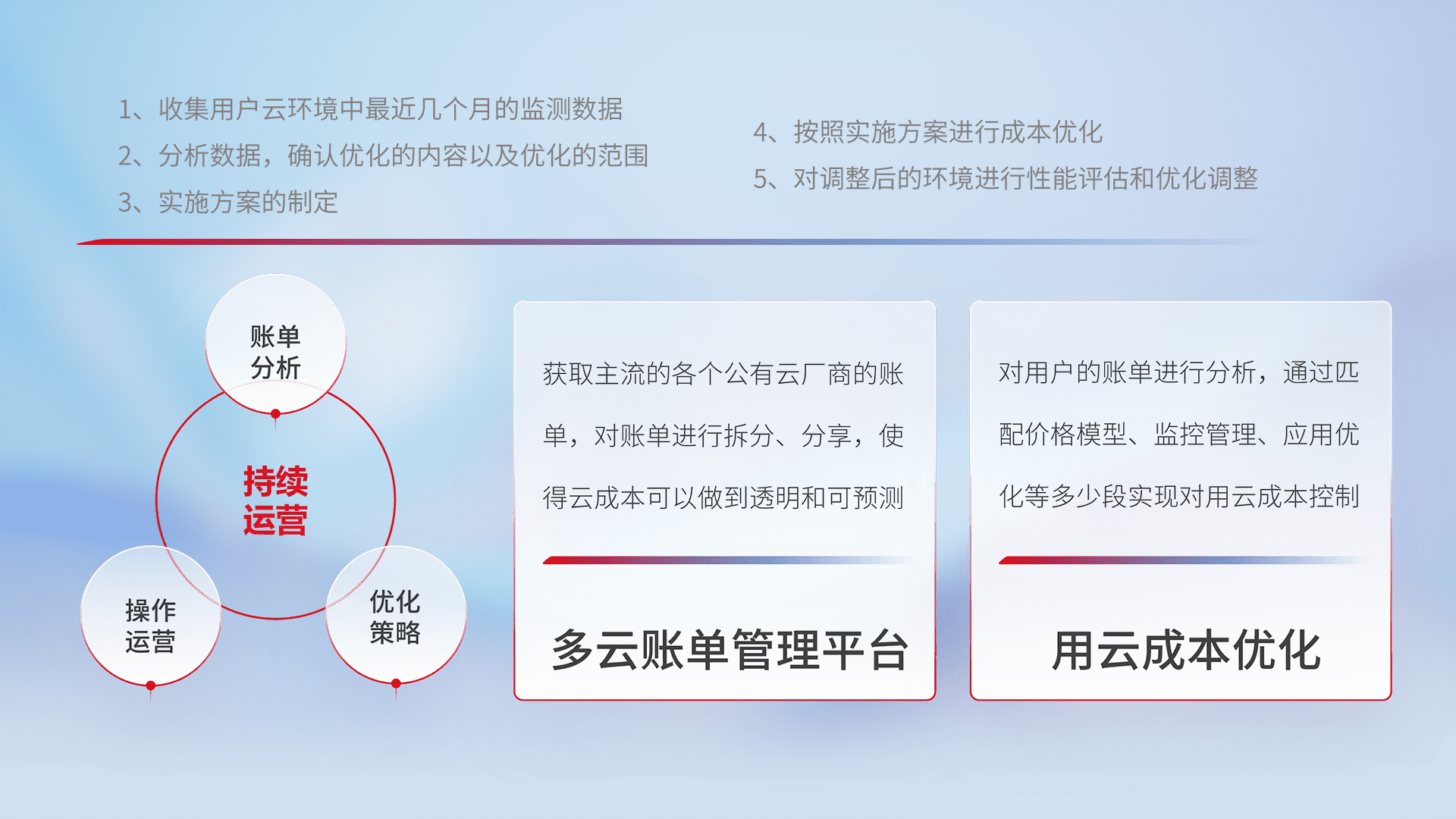 通过多云纳管,,以统一的资源数据模型把客户的云资源进行抽象和封装,,,进而实现对多云资源的统一操作,,,保障云资源管理的可靠性、、稳定性与可用性。。。。量身定制化运维内容,,,,配置、、、、开发运维、、、补丁管理、、、备份、、监控、、、认证和访问管理、、审计和日常巡检等,,,保障在用云过程中的可靠度,,,,稳定度以及高可用率。。